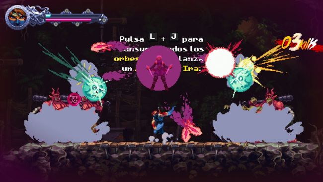 Esto crea un buen ritmo, que se ve respaldado por unos controles precisos. Siempre tienes el control total, y la importantísima sensación de que la muerte solo se debe a tus propios errores está presente de principio a fin. De hecho, no se puede decir con suficiente claridad que jugar a Ragebound es una sensación francamente excelente. Entré repetidamente en un estado de fluidez en el que los giros rápidos, los saltos precisos y los ataques mortales acababan con la excelente selección de enemigos.