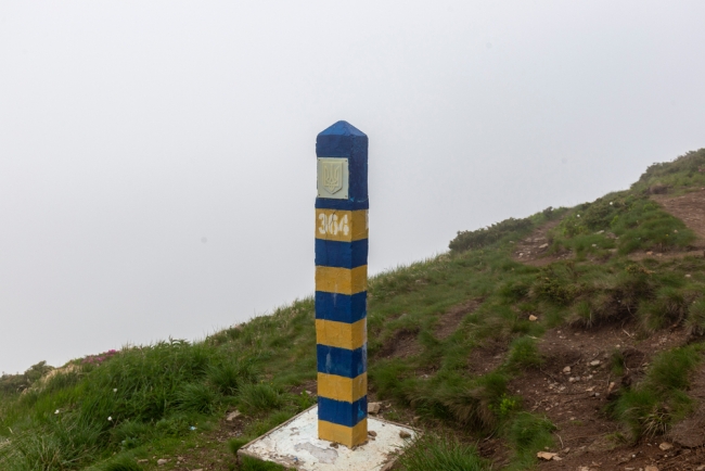 Pilar de demarcación fronteriza en la frontera entre Ucrania y Rumania en los Cárpatos // Shutterstock